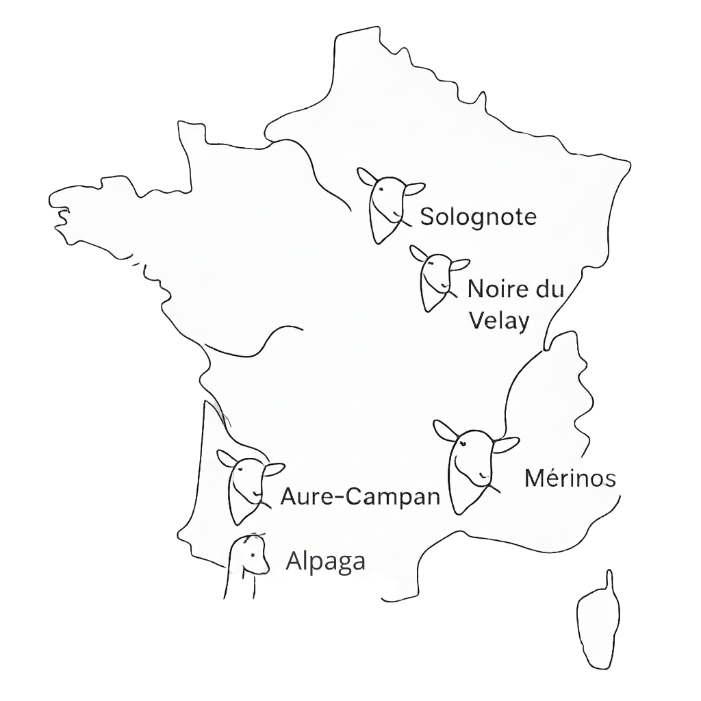 La laine est produite par Jennifer Benoit éleveuse de brebis Mérinos à MEYNES, dans le Gard, Occitanie. La laine est transformée par le collectif « Mérilainos » qui garantit une provenance française et une finesse de la laine